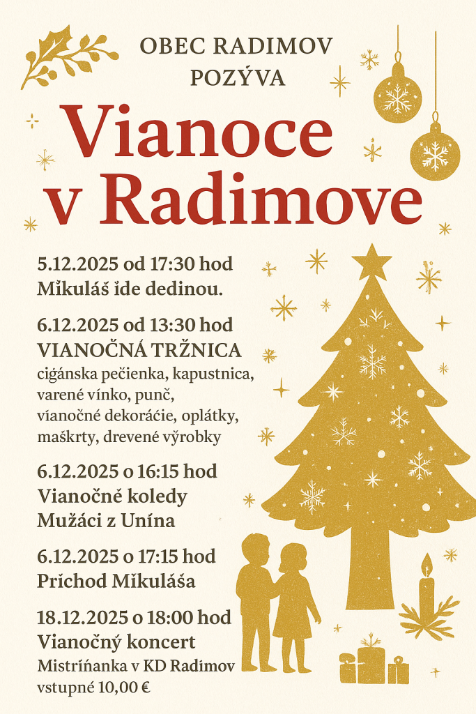 05.12.2025 Mikuláš v dedine 06.12.2025 Vianočné tržnice - Koledy Mužáci z Unína - Obecný Mikuláš 18.12.2025 Vianočný koncert Mistříňanka